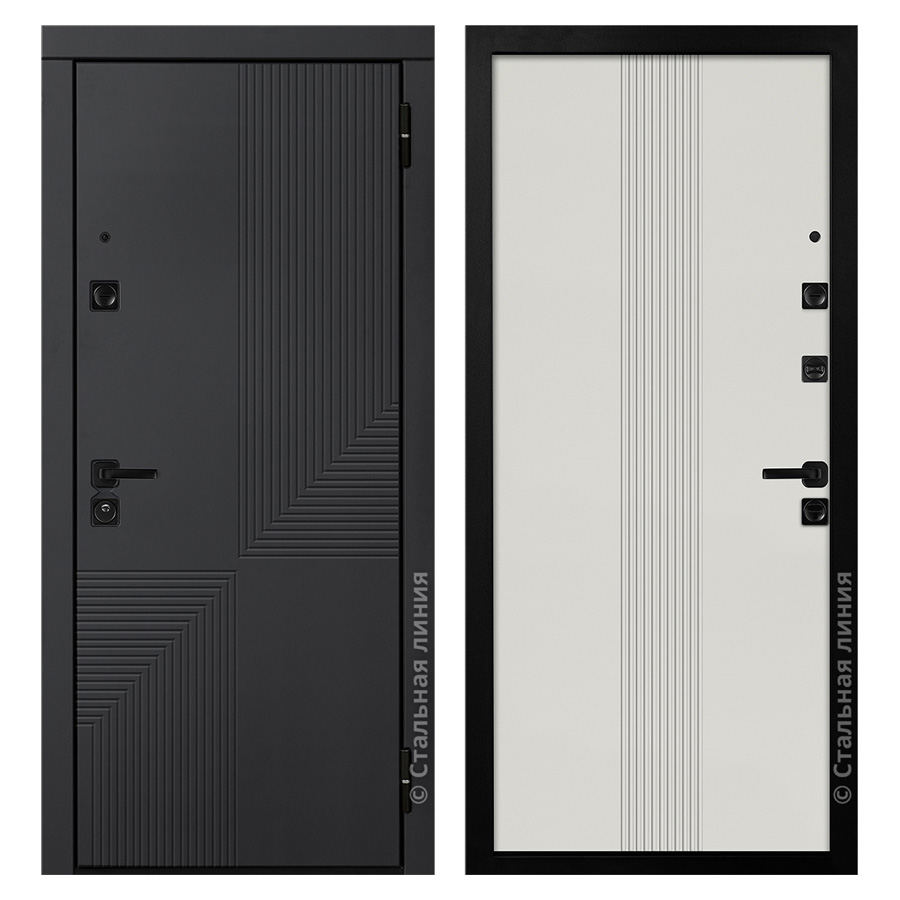 Стильная современная входная дверь в актуальном дизайне. Модель предназначена для установки в квартиру и относится к серии 82. Снаружи — панель MDF (12 мм) с покрытием SteelTex «Шагрень антрацит», внутри — аналогичная панель с отделкой PVC «Шагрень белая». Окраска коробки — полимер «Муар черный 9005».